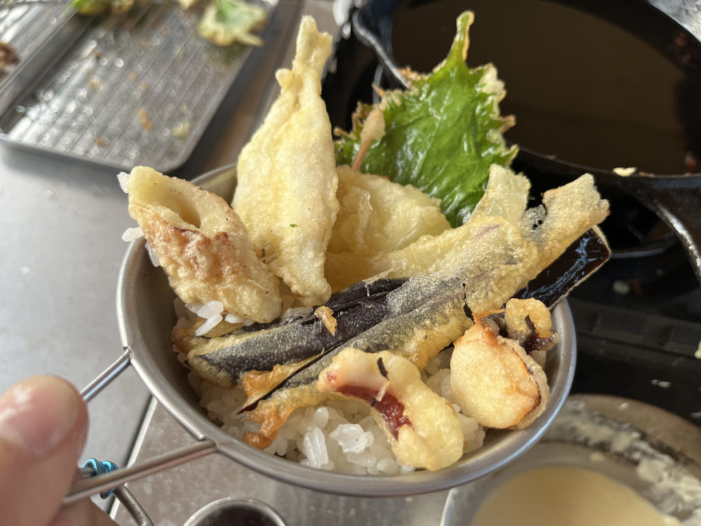 前回参考に、ごはんも炊いてみましていろんな具材をのせて、天丼完成!