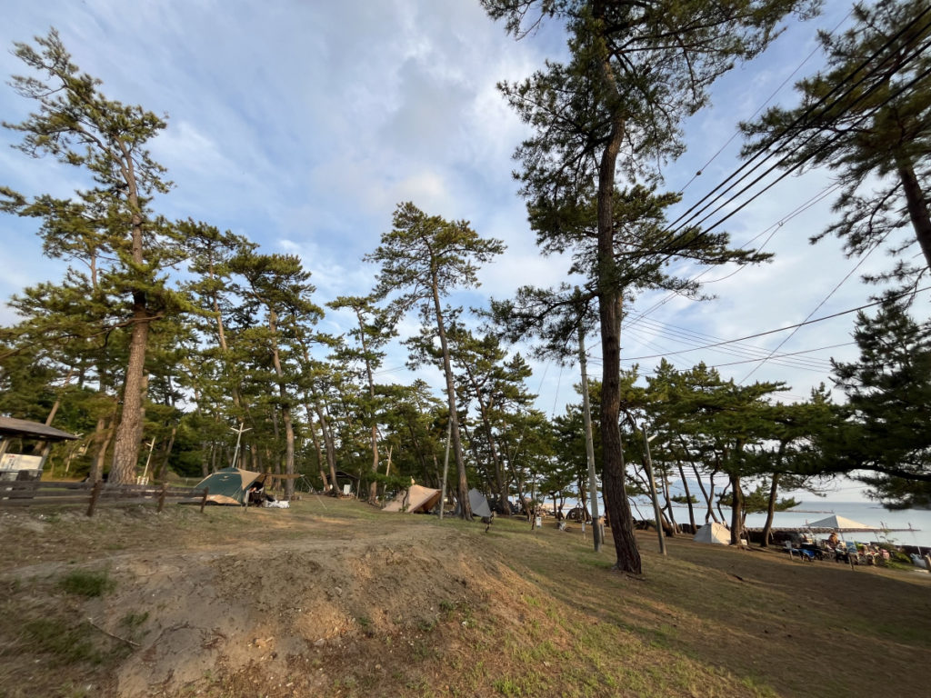 キャンプ場内は、海沿いらしく、松が生えています。