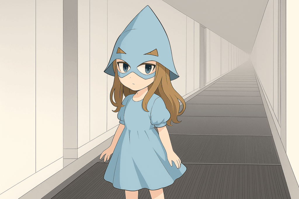 彼女は水色の可愛い裾の広がったワンピースを着て、同じ色の目出しの三角帽子を被り、17歳くらいのように思えた。