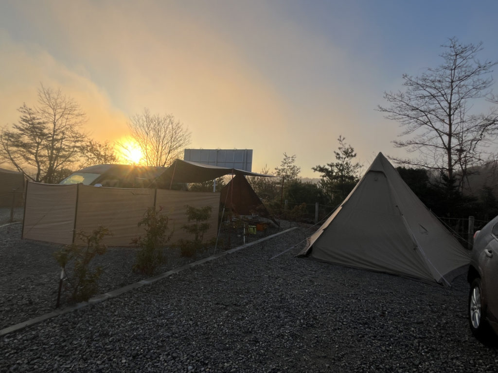 左奥はsusuさんの車で塞がれていますし、3面ふさぐ形になり、焚き火をすると、かなり暖かかったです。
