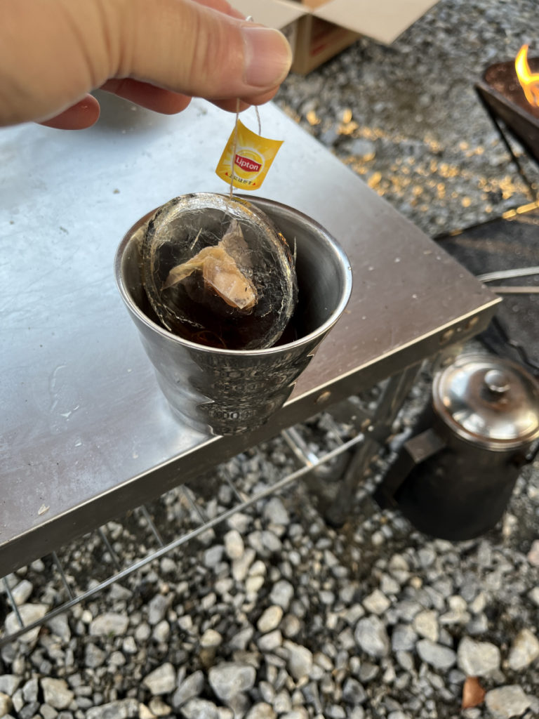 カップの紅茶が凍っています。