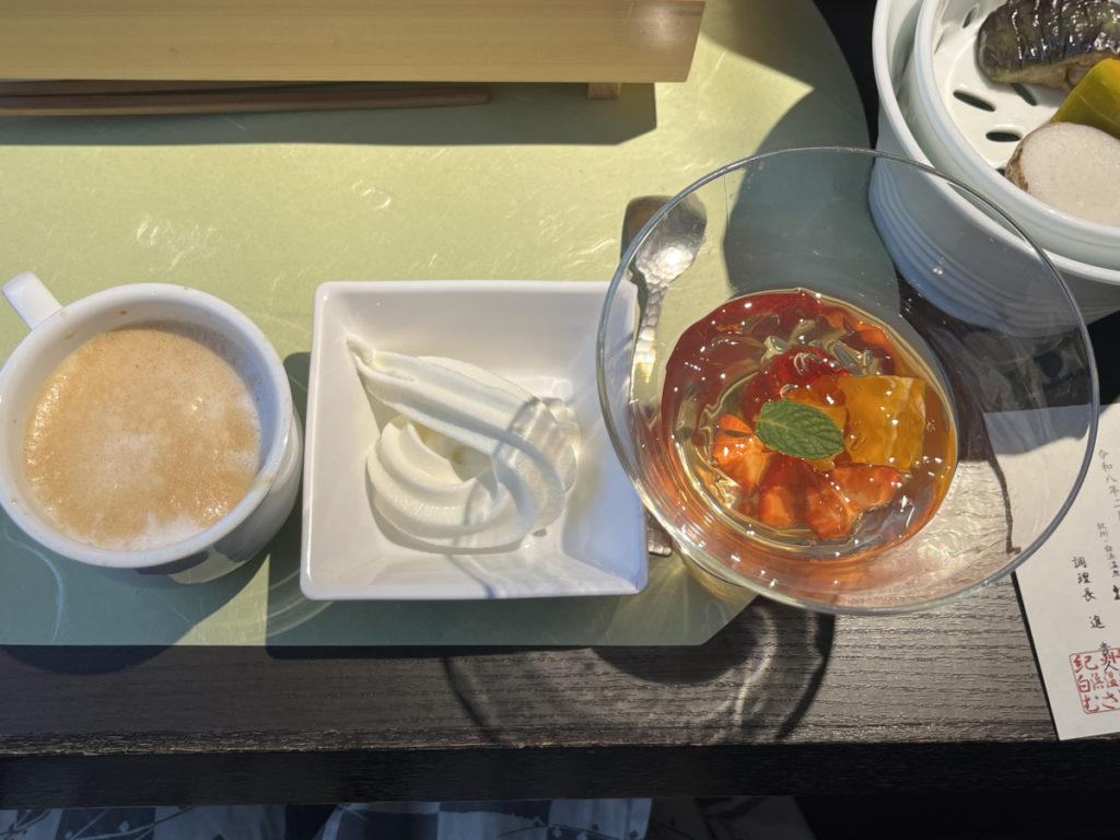 デザートの梅ゼリーと、ドリンクエリアでコーヒーとアイスをいただき!