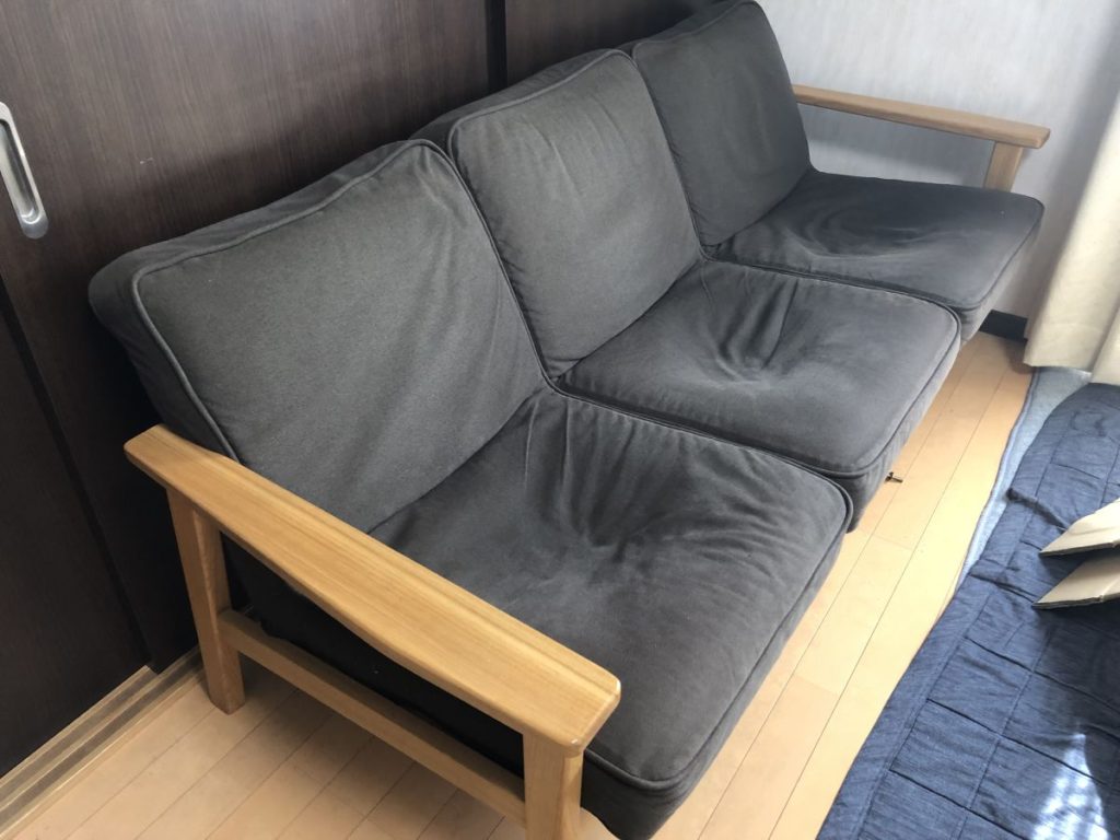 Now, the seat cushions of our Muji “Tamo Wood 3-Seater Sofa” have started to sag again, and I’m working on repairing them.